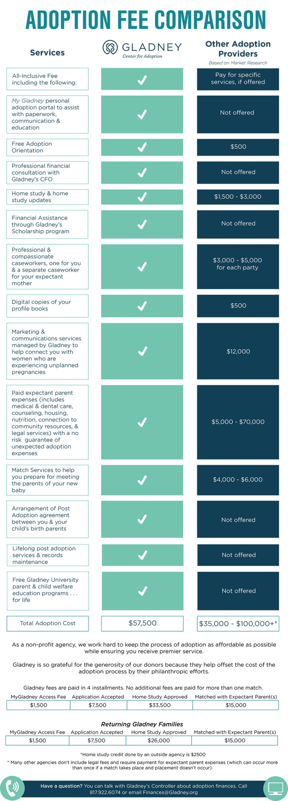 The Gladney Center for Adoption is excited to announce a new all-inclusive fee schedule and scholarship program dedicated to ensuring the cost of adoption is not a barrier to your dream of becoming parents. As a non-profit agency, we work hard to keep the process of adoption as affordable as possible while ensuring you receive premier service.